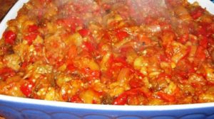 Ingrediente: ( pentru 2 portii) 1 vanata proaspata 1 dovlecel, 1 ardei gras sau gogosar, 1 ceapa,2 rosii, 4 catei de usturoi sare, piper...